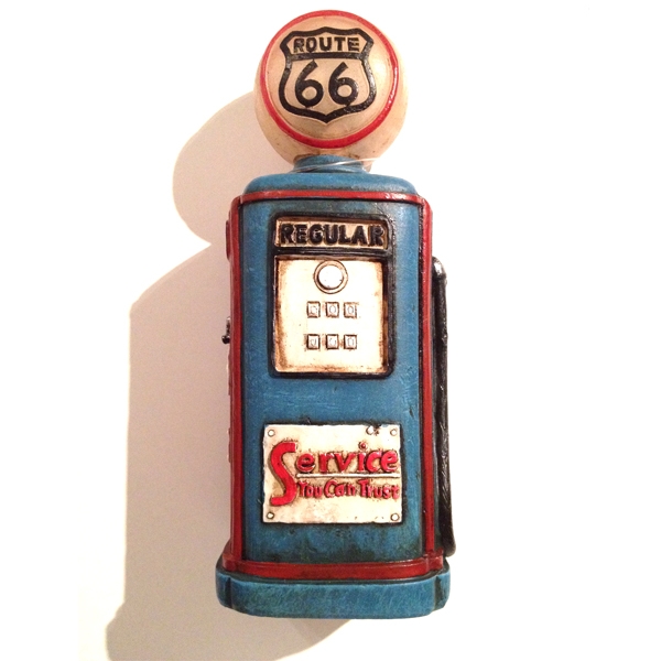 Réplique d'une pompe à essence de la mythique Route 66 illustré de son célèbre logo au sommet. La pompe s'éclaire (voir photos) également. Très bel objet décoratif qui mesure 20 cms x 7.5 cms x 5.5 cms.