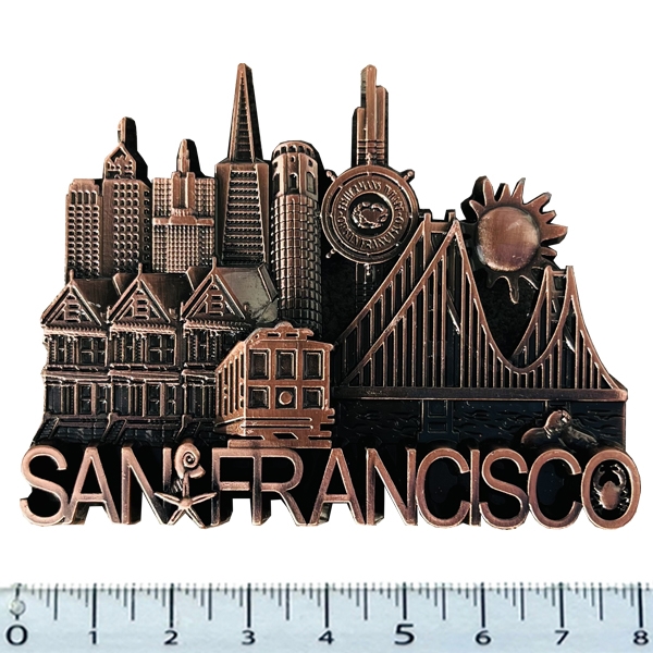 Egayez votre réfrigérateur avec ce magnet en métal représentant divers monuments de San Francisco. Les dimensions sont les suivantes: 8 x 6 cms.